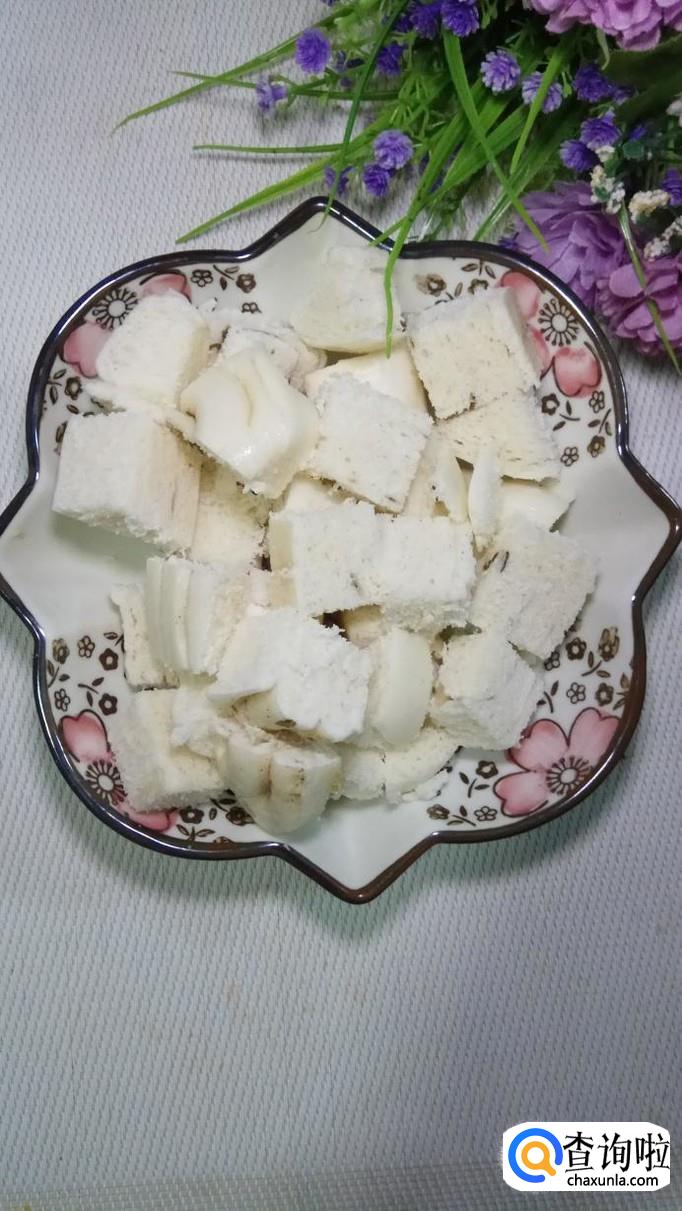准备一个吃剩的花卷儿,用刀切成大方块儿,小编喜欢将花卷儿在冰箱的软冻区,稍微冻一下,这样切起来更容易。