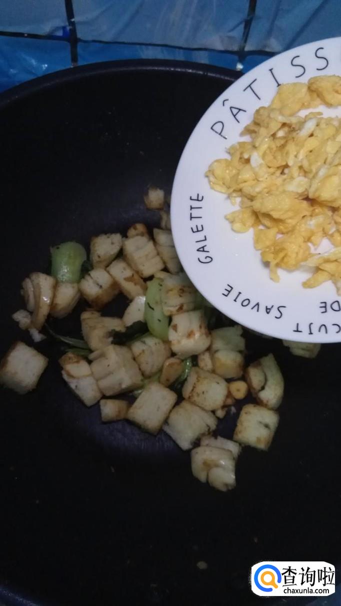 然后将炒好的鸡蛋倒入锅中,搅拌均匀。