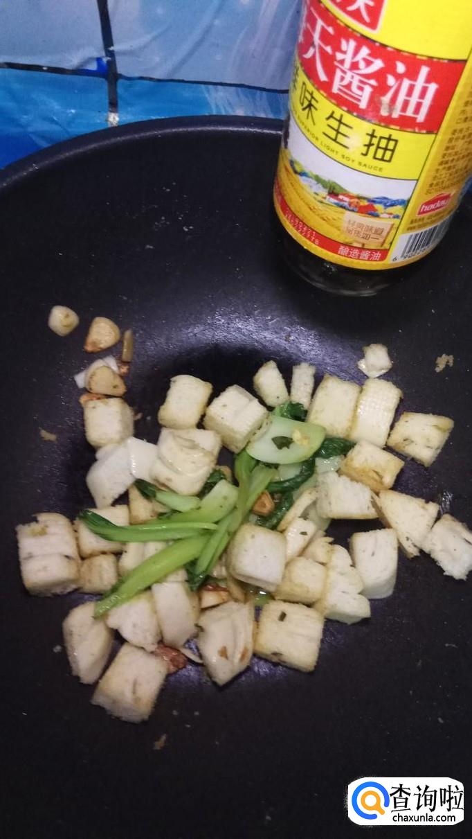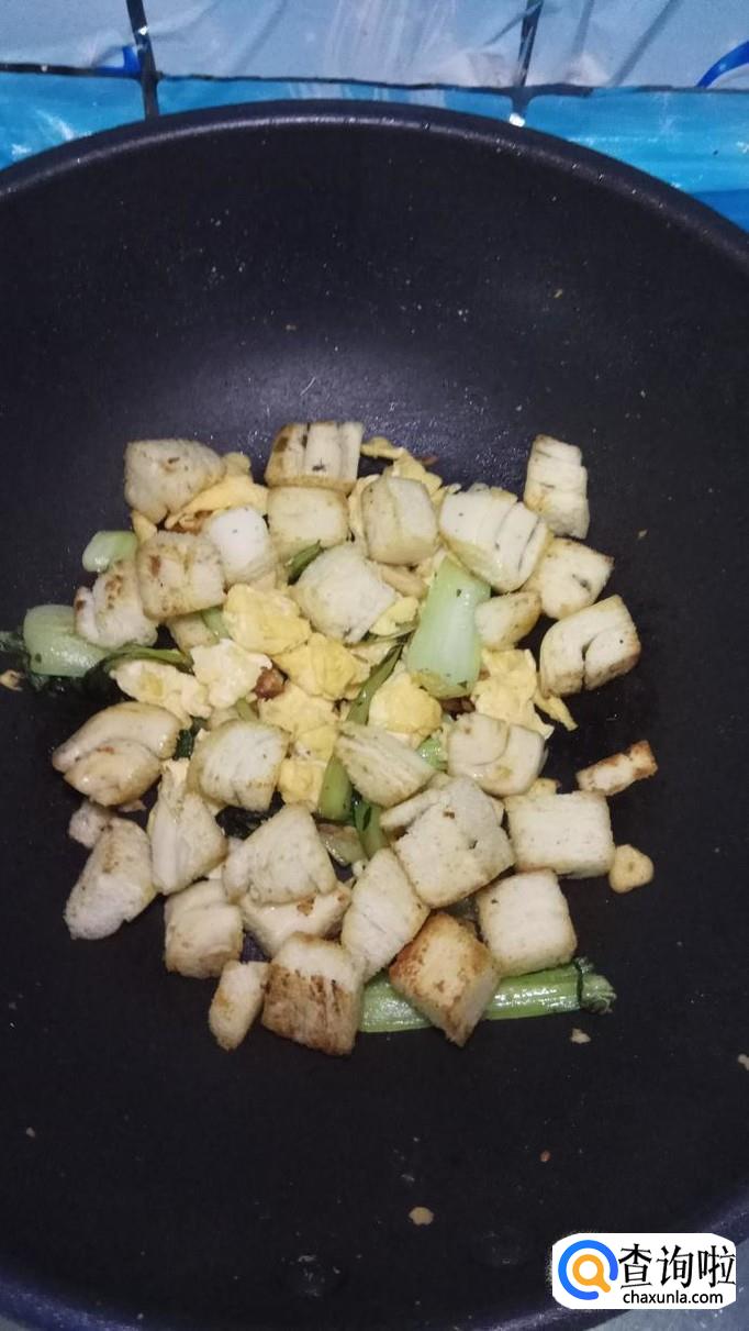 将切好的馒头倒入锅中,快速翻拌均匀,要不停的翻动,防止糊锅,看到馒头块儿表面微微发黄就差不多了。可以淋入少许生抽。