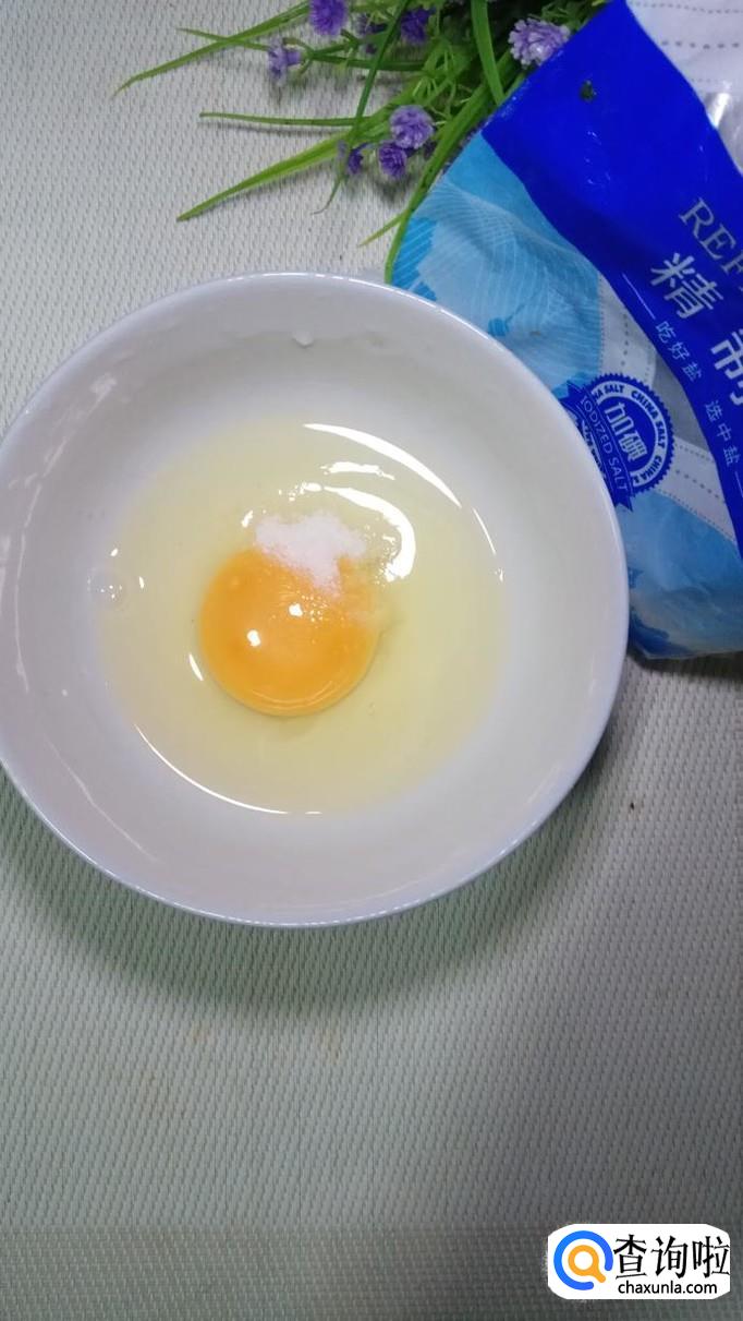 碗中打入一个鸡蛋,加入适量盐和料酒,用筷子搅拌均匀备用。