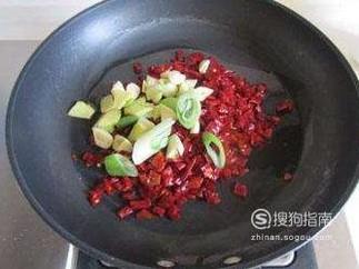锅中放入食用油,油热后,放入葱和辣椒,炝出香味和辣味。
