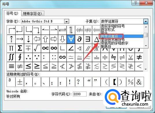 点击符号选项,在弹出的对话框内我们找到数学与运算符号选项,如图所示: