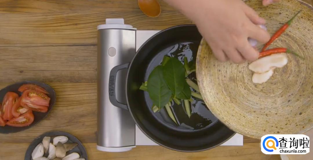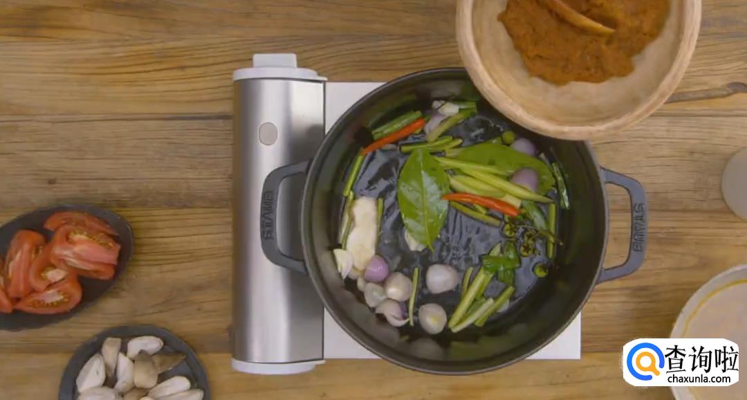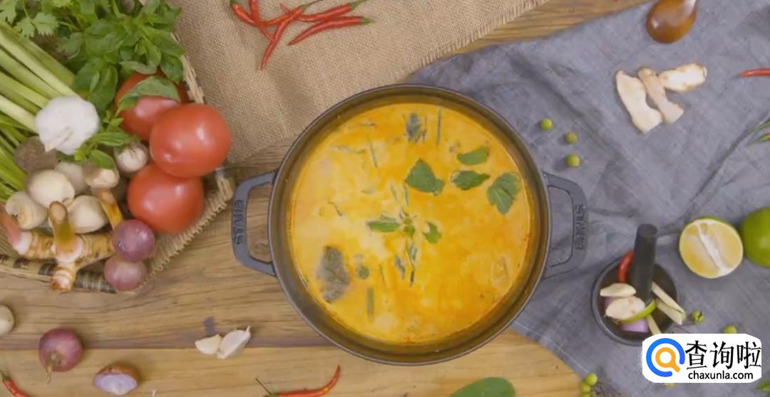 鱼露,辣椒粉,红咖喱酱,虾酱,罗望子酱,橄榄油,盐,白糖,大芫荽叶,薄荷叶,罗勒叶,柠檬叶,香葱,香菜,椰浆,橄榄油适量
