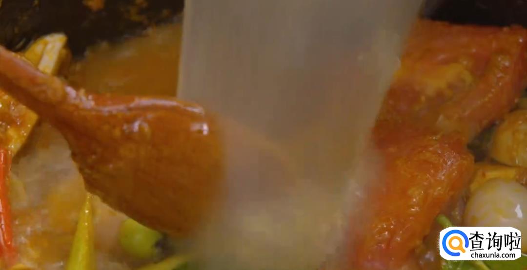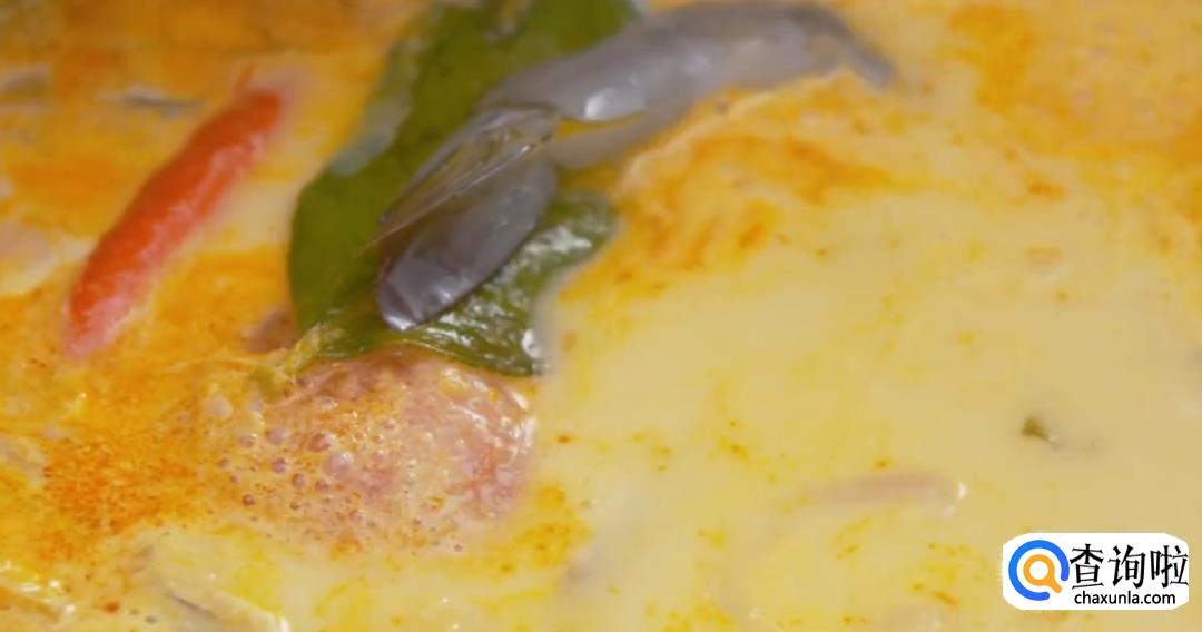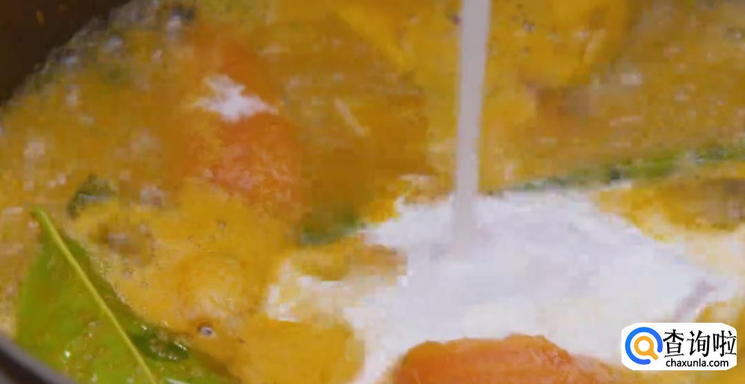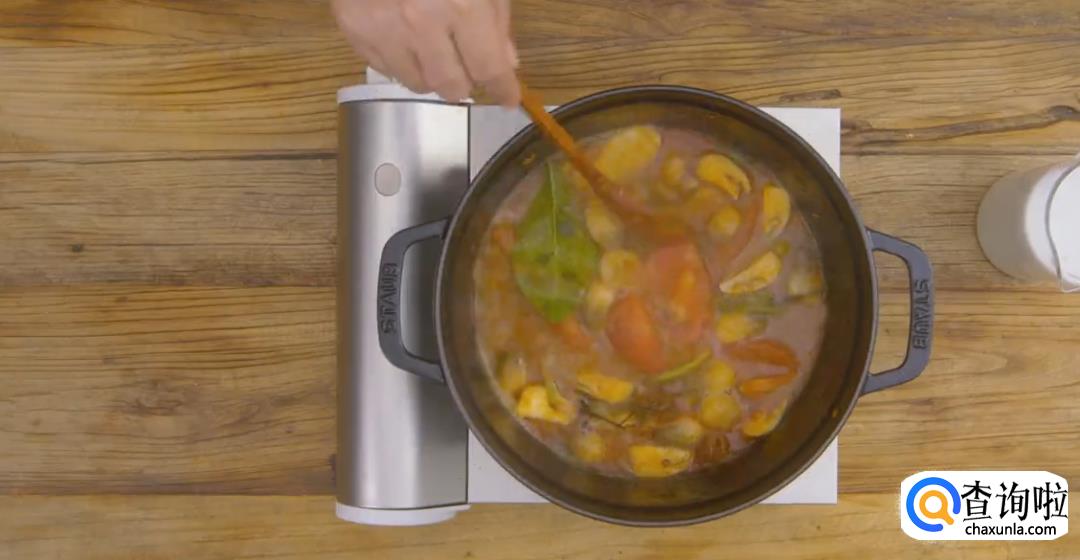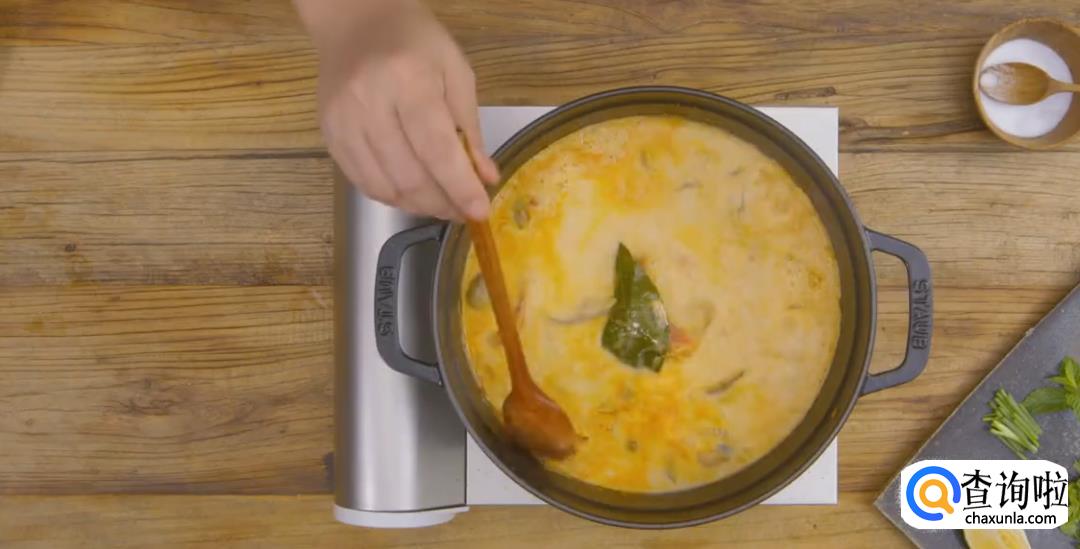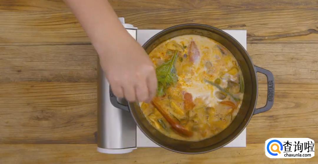 倒入虾汤熬煮两分钟,再加入椰浆,然后搅拌均匀,盖上锅盖转中小火炖煮5分钟左右。