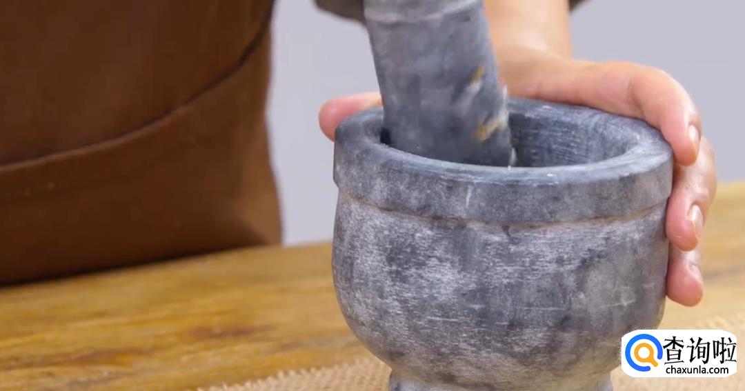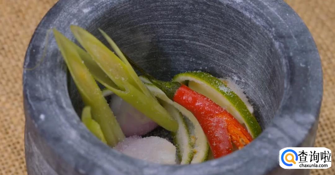 首先来做底料,将切好的香茅草,南姜,蒜瓣,小洋葱,青柠皮,小米辣放入杵臼,加少许盐巴捣烂。