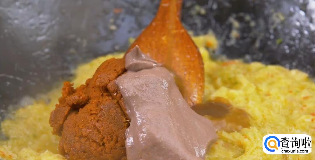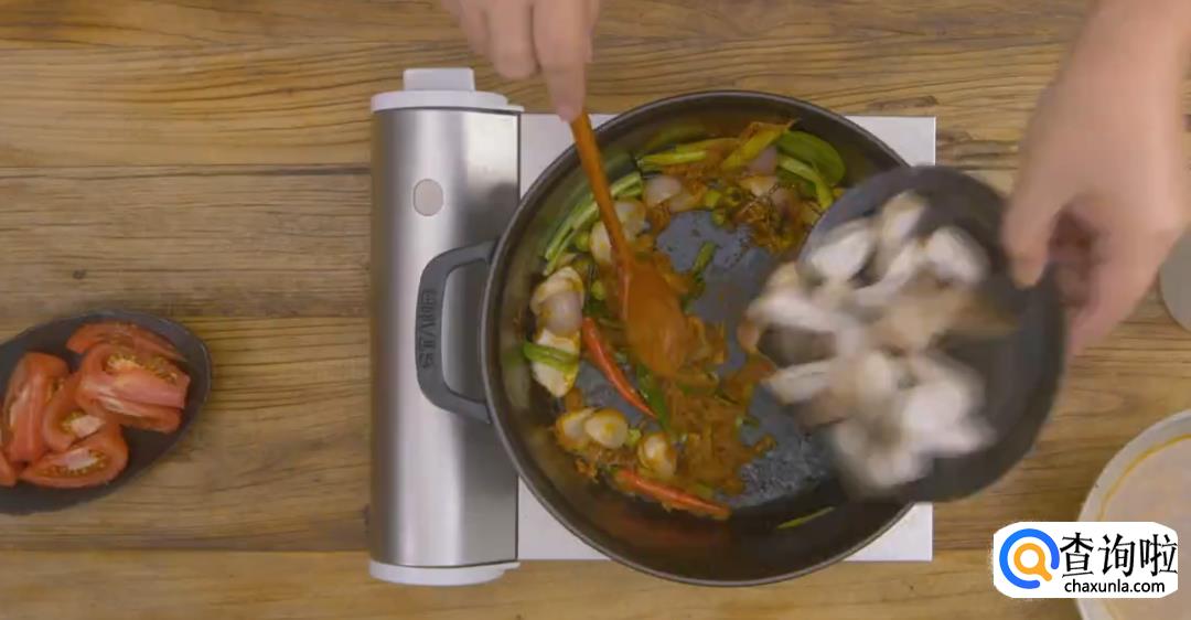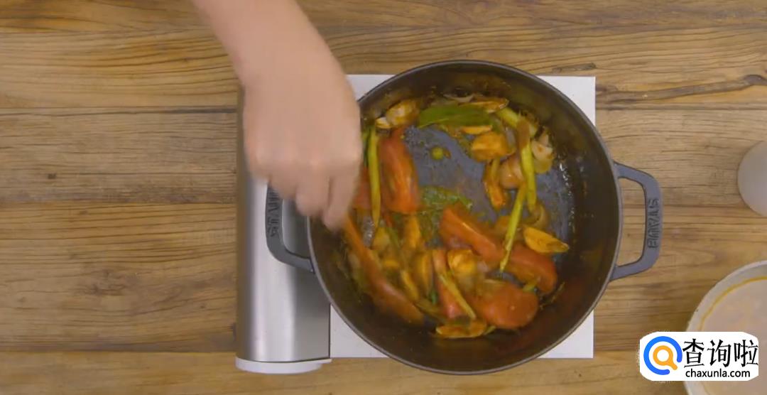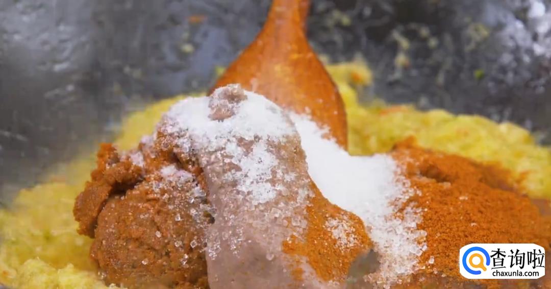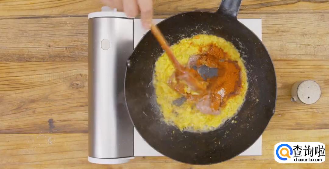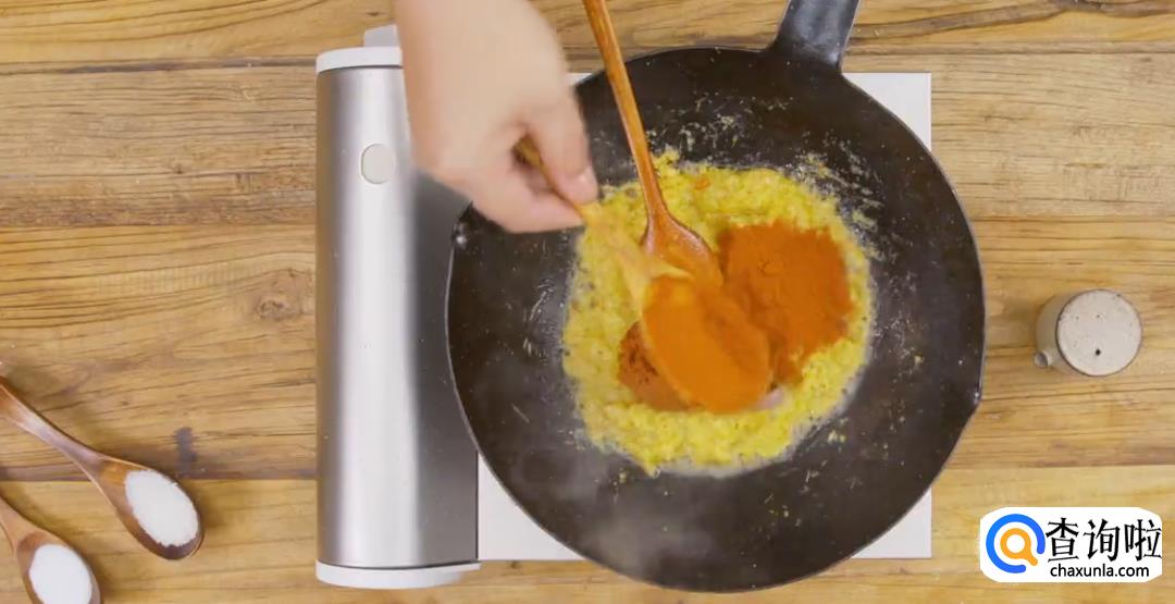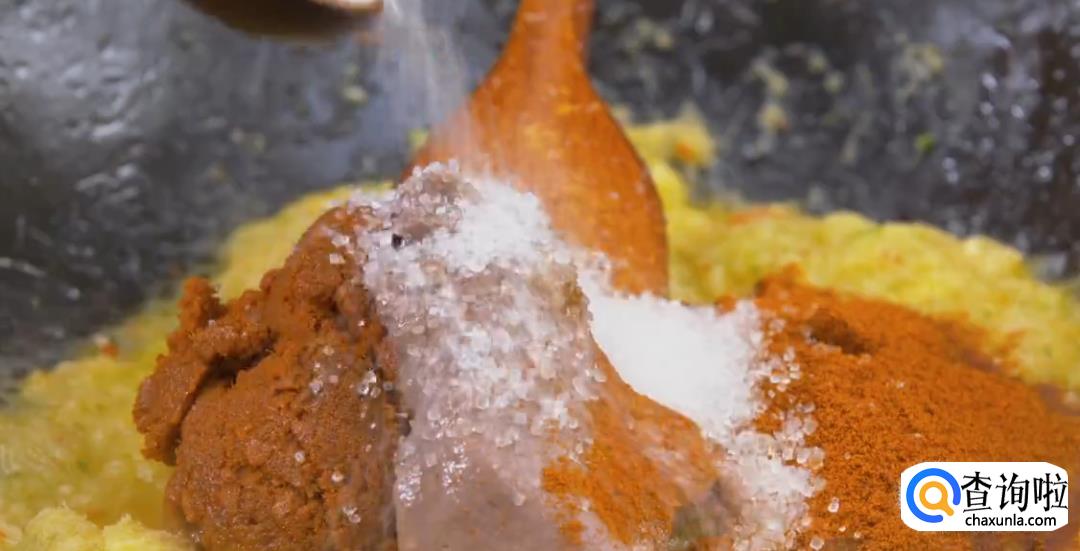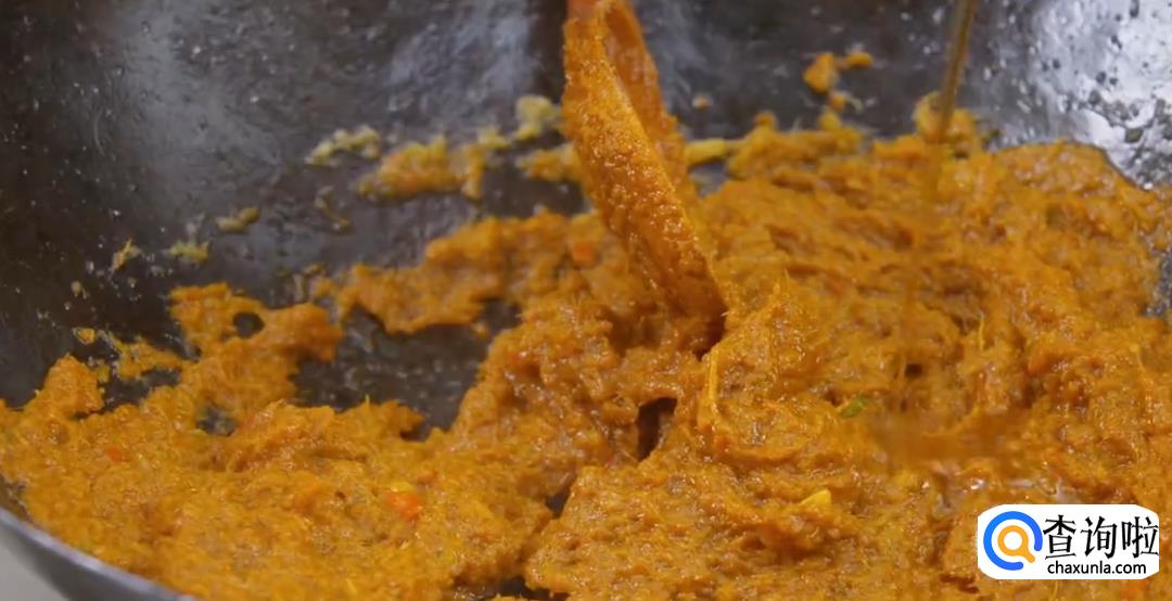 加入红咖喱酱,虾酱,罗望子酱,放干辣椒粉,加白糖,食盐不断翻炒均匀。