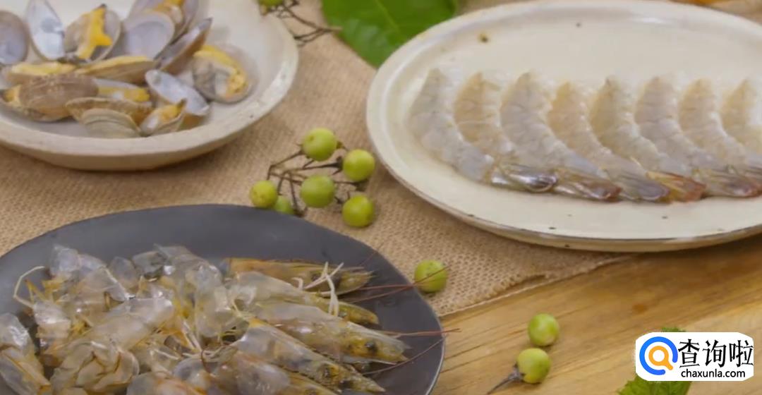 基围虾剥壳,然后去掉虾线,虾头和虾壳备用。花蛤提前焯水至开口备用。