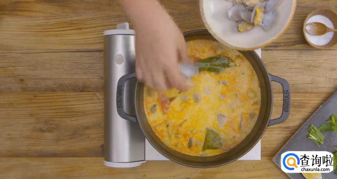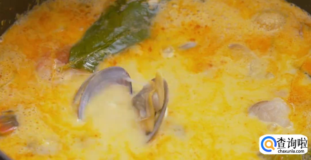 放入基围虾和花蛤,继续熬煮2分钟