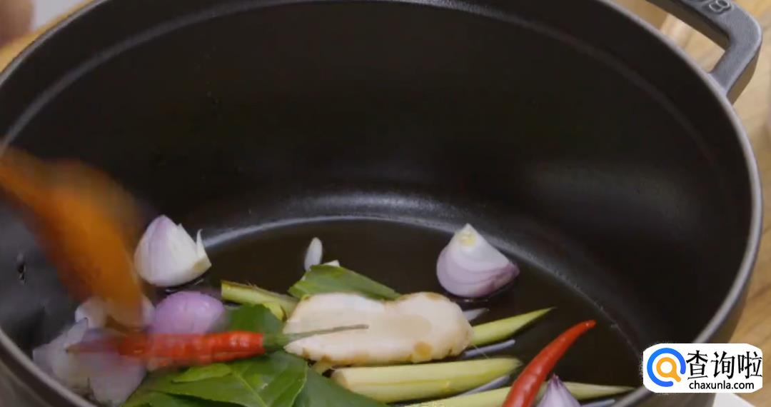 另起热锅,加入橄榄油,放入幼茄,香茅草段,大芫荽段,青柠也,小洋葱,南姜,小米辣,然后煸炒出香味,
