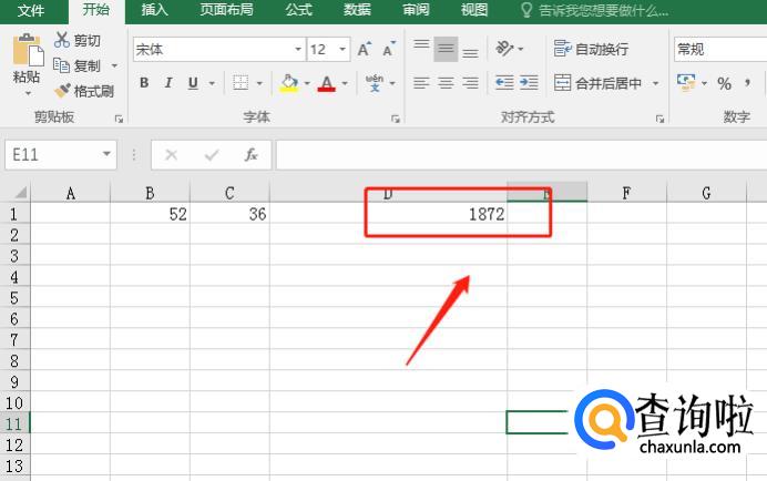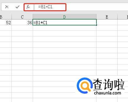 在表格B1中输入52,在C1中输入36,然后鼠标选中D1,在函数框中输入公式“=B1*C1”。