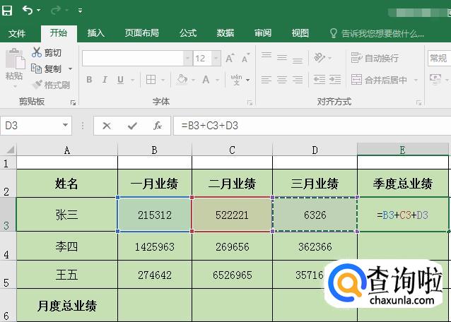 这种方法是最简单也是最常用的一种方法,适合新手,直接在E3单元格输入“=”。光标点击需要进行求和的单元格,也就是B3,再输入“+”,再次选择C3单元格,再次输入“+”,最后选择D3。完成后敲击键盘上的【回车】键即可获取结果,你也可以直接在E3单元格输入“=B3+C3+D3”回车,是同样的效果。