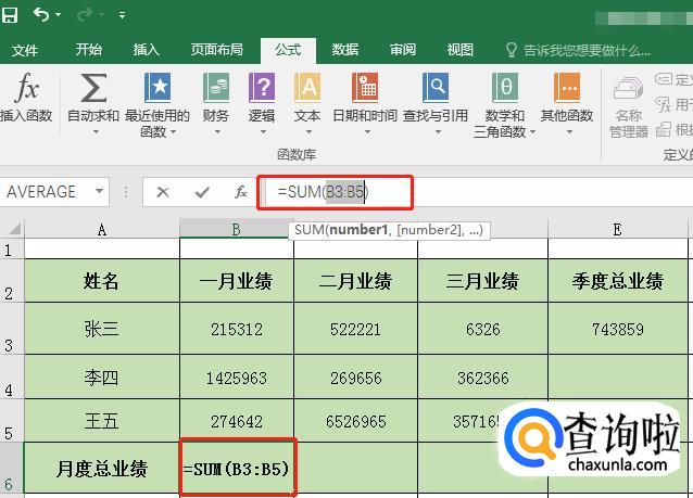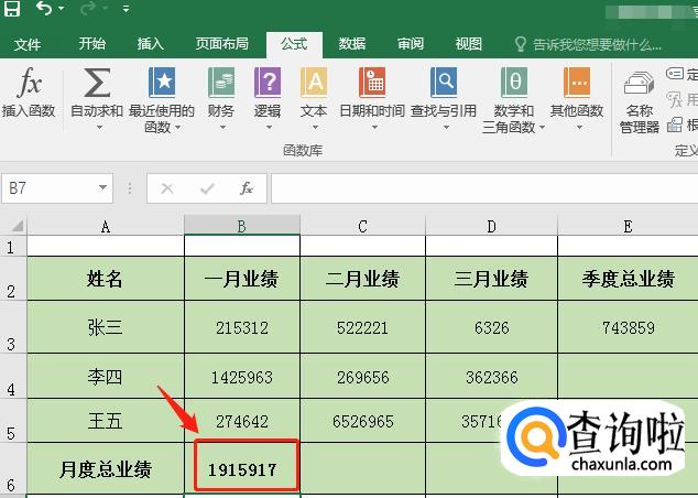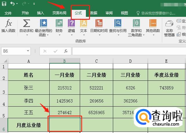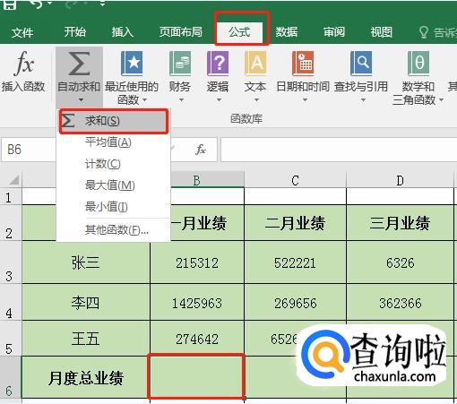 选中B6单元格后,点击【公式】菜单栏,选中【自动求和】内的【求和】。