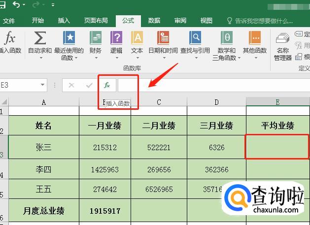 点击张三的“平均业绩”所在单元格E5,然后点击表格最上方的【插入函数】按钮。