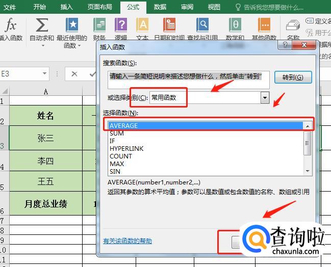 在弹出的“插入函数”窗口中,选择函数“AVERAGE”,然后单击【确定】按钮。