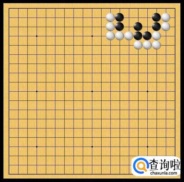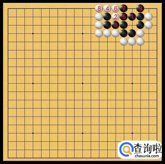 黑棋于黑9处立,原来,黑棋正是利用对进行渡过的白棋的打吃而形成了做眼的绝佳位置。黑9的立使得黑棋已经有了两个眼位。黑棋存活。如图所示。