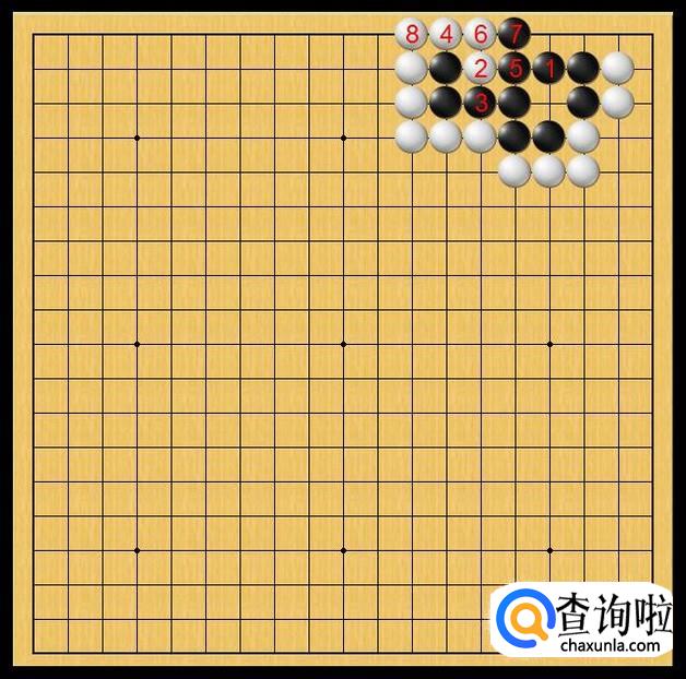白棋于白8处粘上,现在,白棋已经安全的渡过,白棋外围对黑棋的防守固若金汤。如图所示。