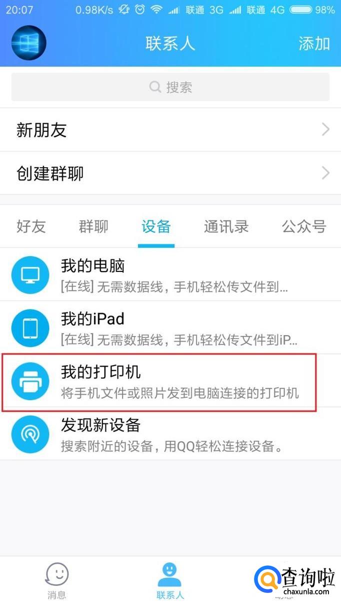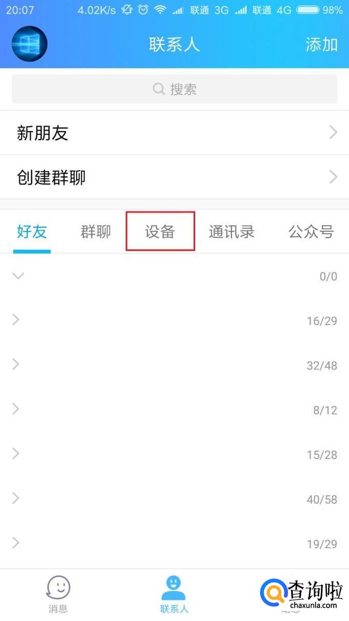 首先,打开手机QQ主页面,点击联系人页面中的“设备”菜单项。