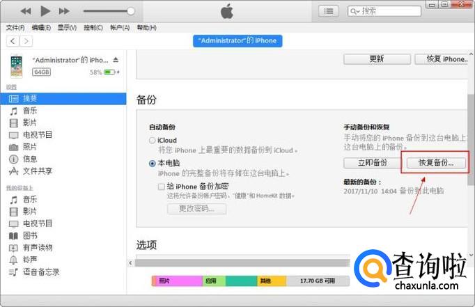 备份完毕,连接新手机,并运行iTunes软件,在软件上选择“恢复备份”,这样旧手机上的数据就可以转移到新手机上。