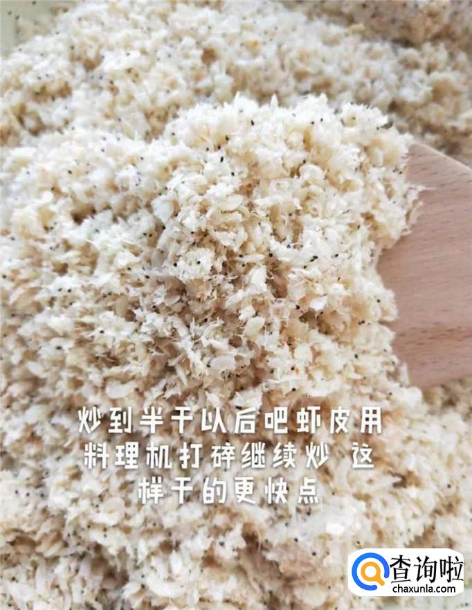 等到虾皮炒到半干的时候,用料理机把虾皮打碎,继续翻炒,如下图所示。小贴士:这样做能让虾皮干的快。