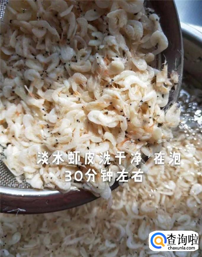 首先把淡水虾皮洗干净,倒入白开水中浸泡30分钟左右,如下图所示。