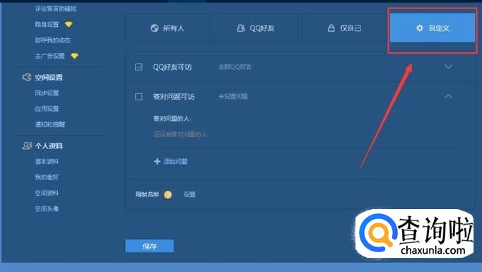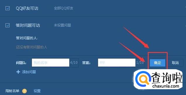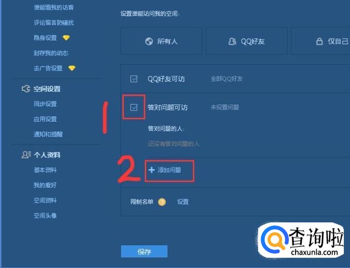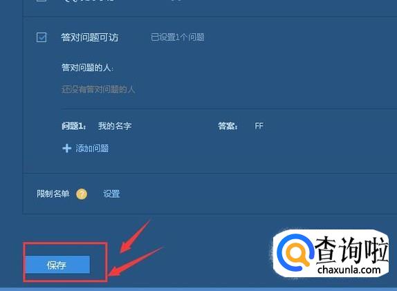 选中答对问题可访,再点击添加问题,问题设置成功后点击确定,最后记得点击保存。