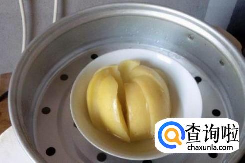 最后把苹果切成小块,撒上适量的冰糖,放入蒸锅中隔水蒸熟即可