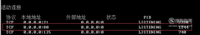 打开命令行cmd,输入netstat -ano查看端口使用情况。例如我这里要找是谁使用了80端口。