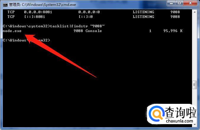 回车执行该命令。查看是哪个进程或者程序占用了 8081 端口,结果是:node.exe。
