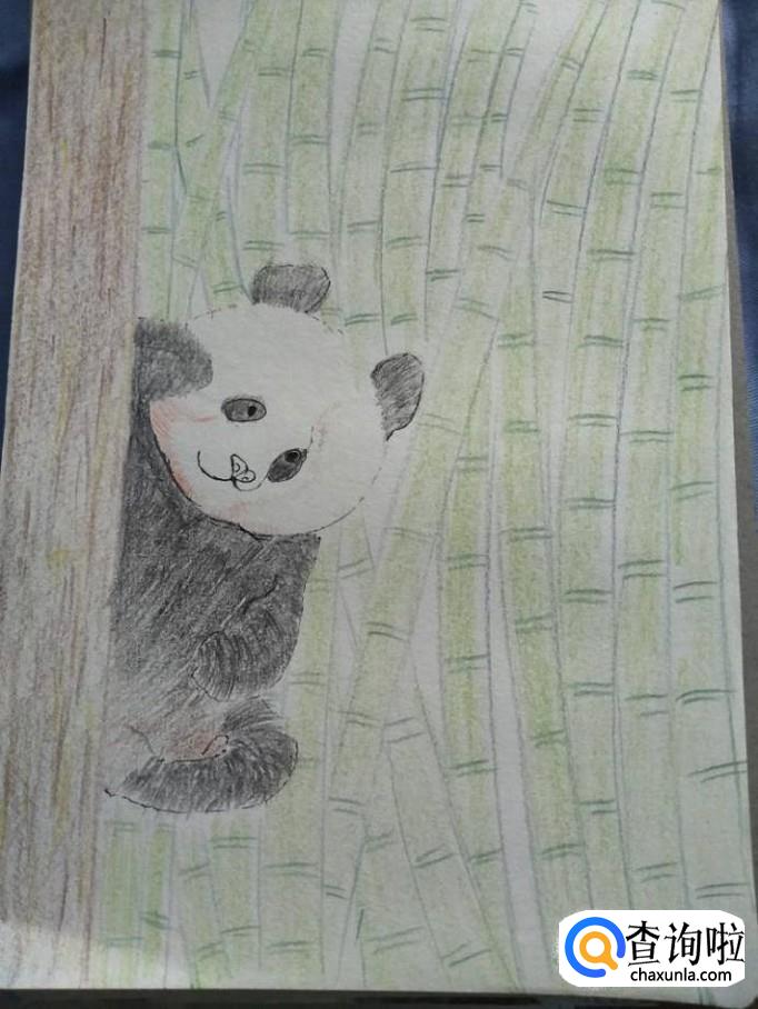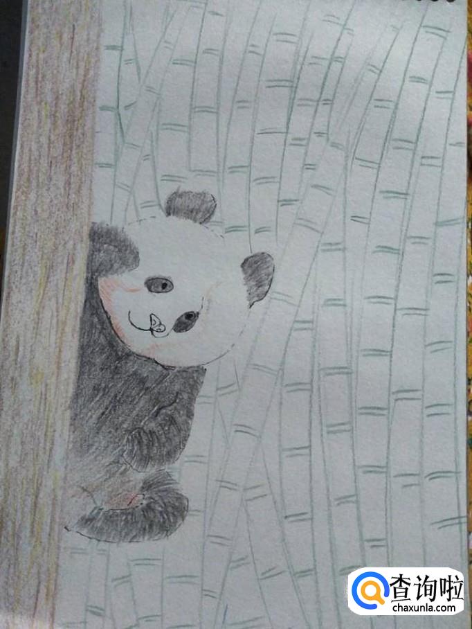 注意整体布局,颜色搭配。这样一幅熊猫隐藏在竹林中的画就画好啦,你学会了吗?