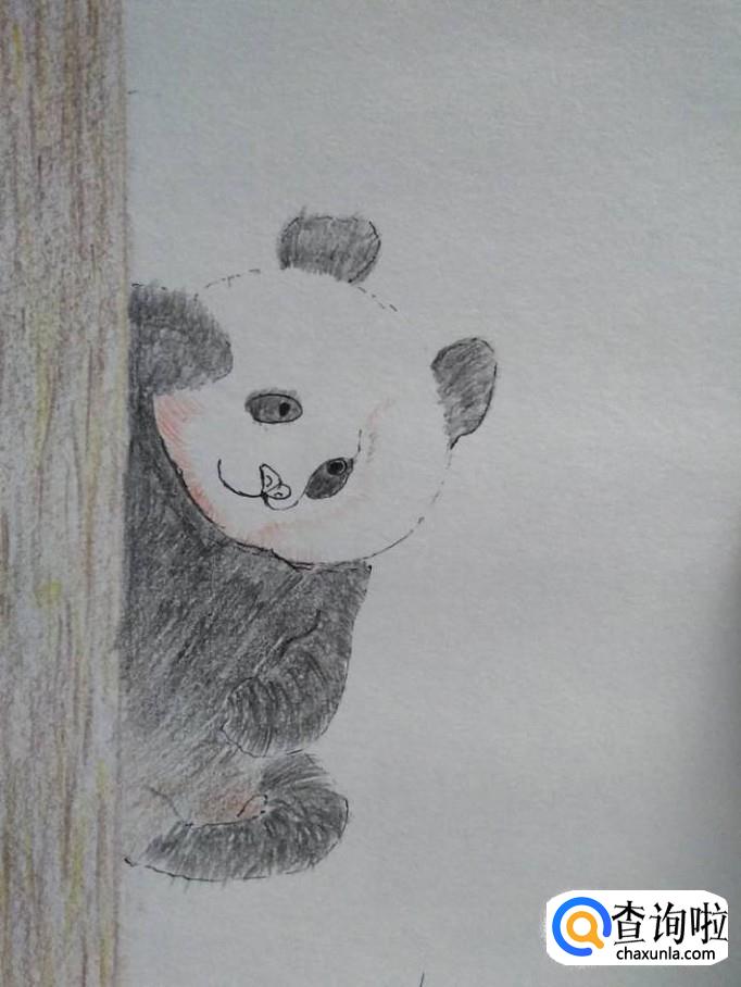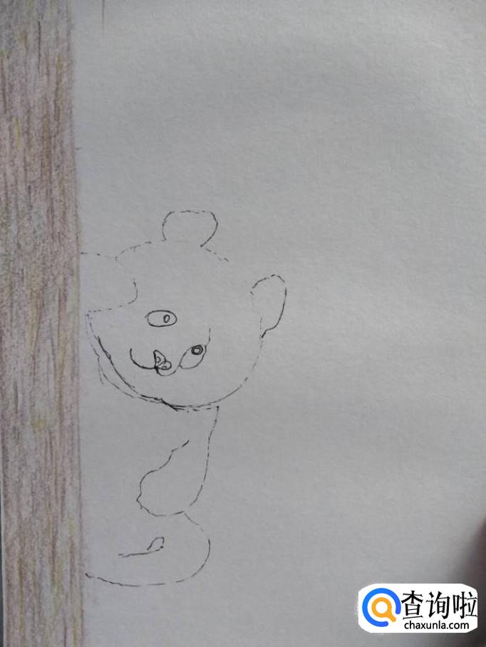 在树旁画出熊猫的形状。先画大熊猫的外部轮廓可以先画头部,然后再画身体。注意熊猫要画得倾斜一点,下半部分的一边腿隐藏在树中。再画熊猫的五官。