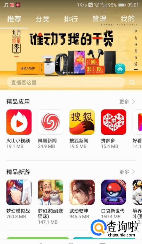 打开华为应用市场,每个用户的华为手机里面都有华为应用市场。(就像ios系统的App store一样)