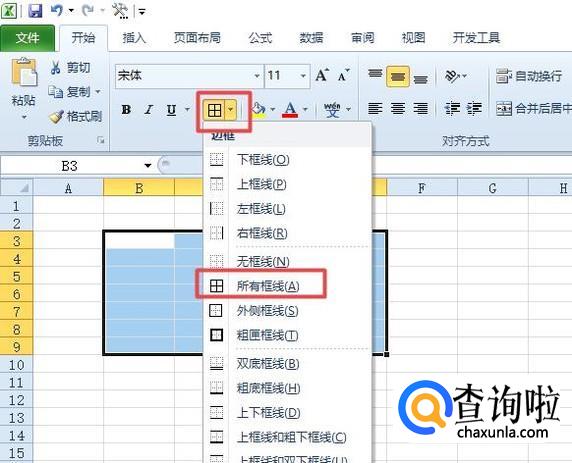 然后我们点击边框按钮边上的下拉箭头,弹出的界面,我们点击所有边框;