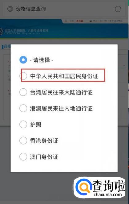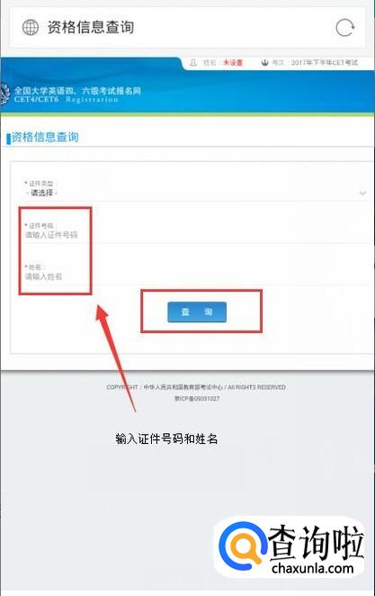 跳转到资格信息查询,这个界面我们需要选择证件类型,一般都是选择居民身份证,输入身份证号码后,输入自己的姓名,最后点击查询。