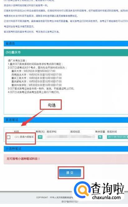 在报考界面找到有“英语笔试”,勾选报考科目,点击提交。