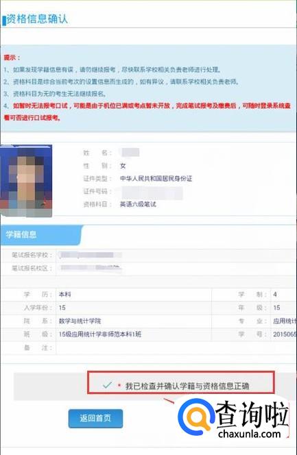 页面跳到资格信息确认,确认自己的各项信息无误后,勾选下方的确认选项,点击“保存并继续”。如图。