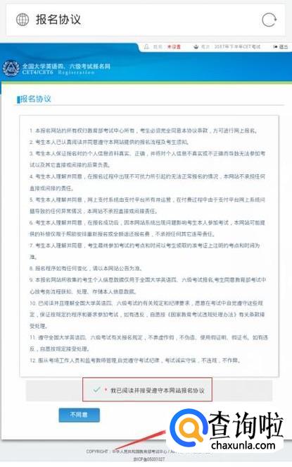 点击“开始报名”后,会出现一个报名协议,勾选接受协议后,点击“同意”。
