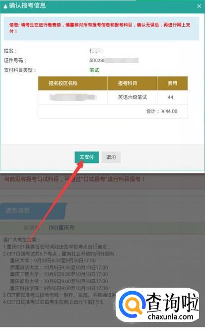 此时会弹出一个小窗口,确认报考信息,确认无误后,点击去支付。