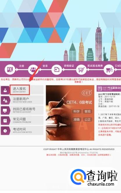 打开一个浏览器,输入网址http://cet.etest.net.cn/,进入全国生英语四、六级报名考试网。
