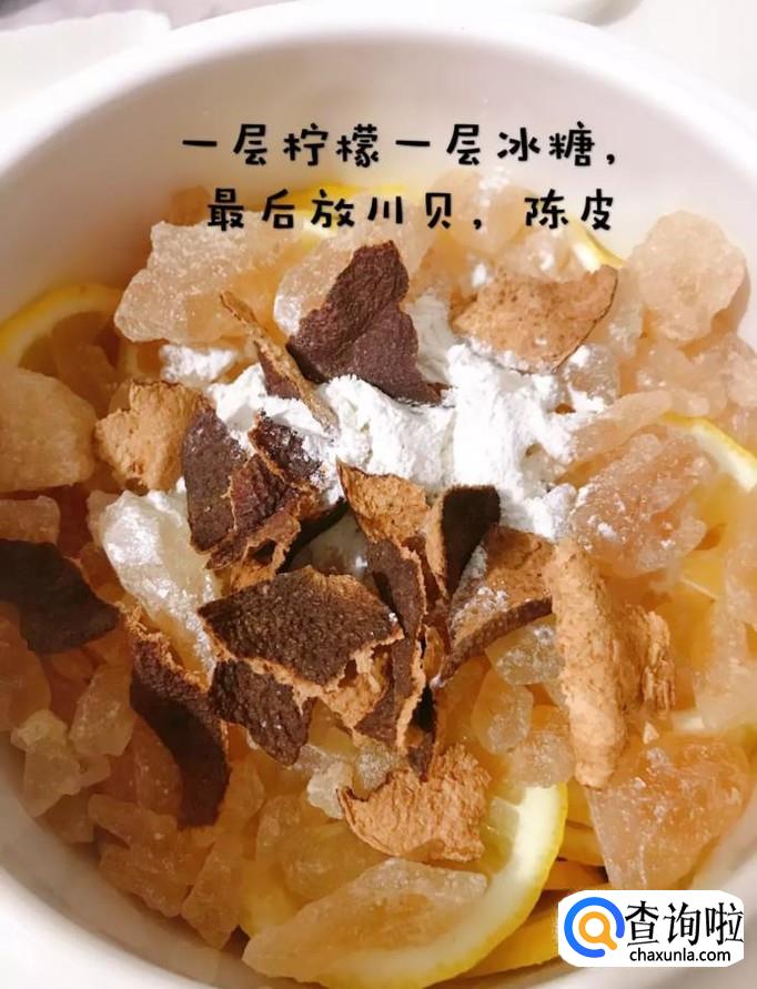 食材:陈皮10克,川贝粉15克,老冰糖800克,柠檬500克,盐适量。