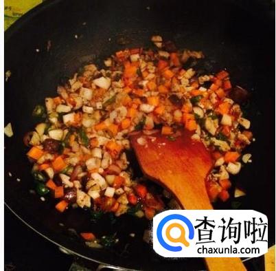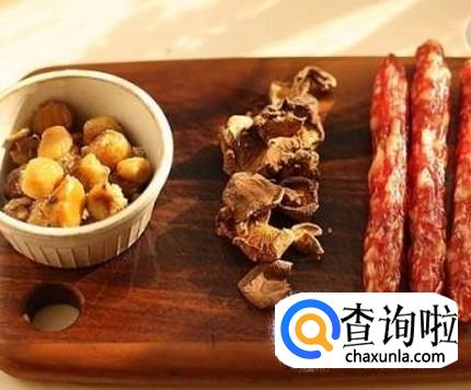 首先将腊肠洗干净,切成小块;香菇发胀然后去跟切好备用;胡萝卜洗净后切成丁状;姜切丝;