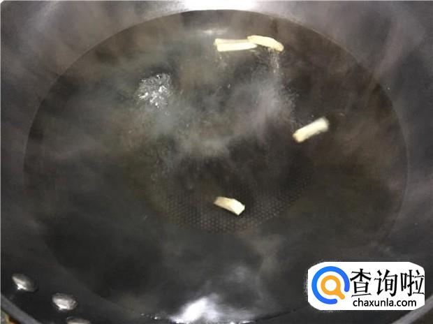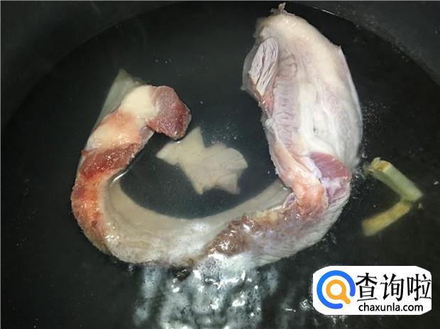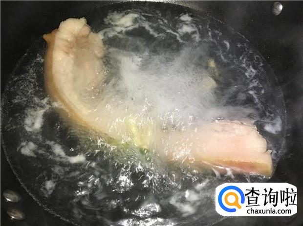 锅里放入几片姜,煮开一锅水,水开后,把整条五花肉放入锅里煮。