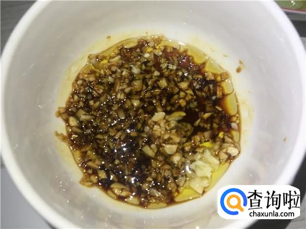准备好适量的姜蒜,把姜蒜剁碎,加入适量的花生油、酱油、蚝油、盐,搅拌均匀,用来沾白灼五花肉的酱汁。