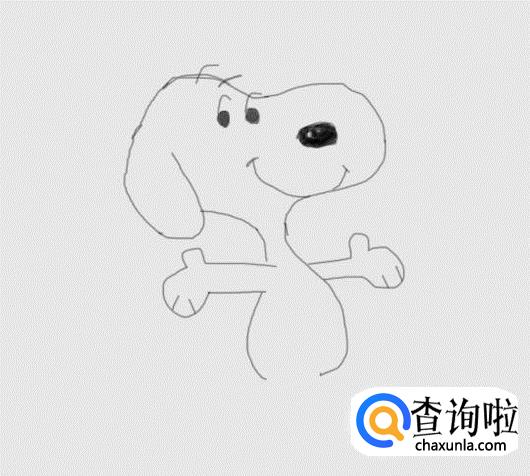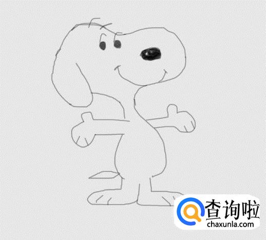再在身体的下面画出史努比的两条腿及脚掌,最后在身体后面再画出史努比的尾巴,这样可爱的史努比就画好了,如图所示:
