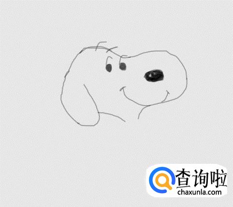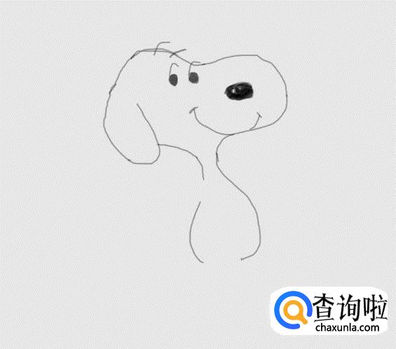 在史努比的头部上画出史努比的两只眼睛,然后在眼睛上画出史努比的眼睫毛,再在头部上画出史努比的鼻子,如图所示: