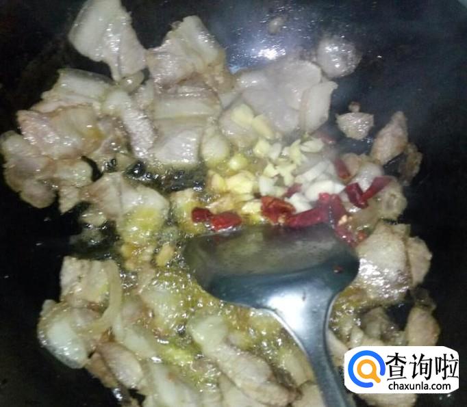 直到肉片大致煸干,加入姜、蒜、干辣椒等。