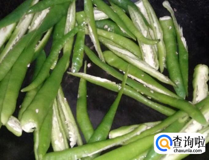 锅热以后,放入辣椒翻炒,注意不需要放油,直接干炒。目的在于焙干水分,利于辣椒吸油。