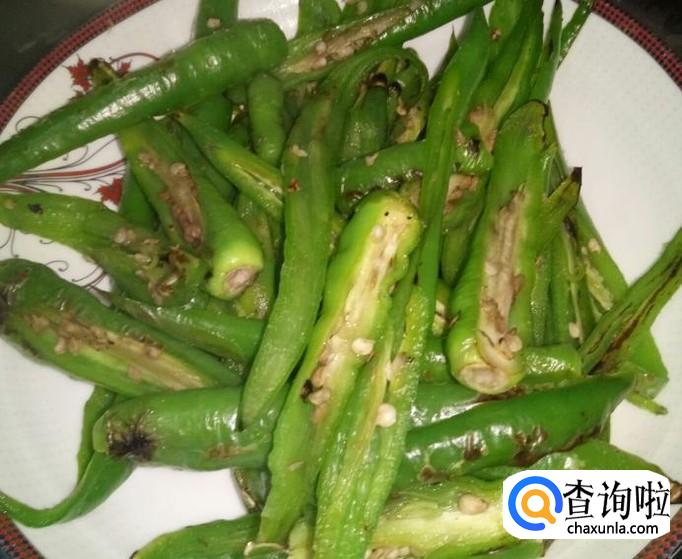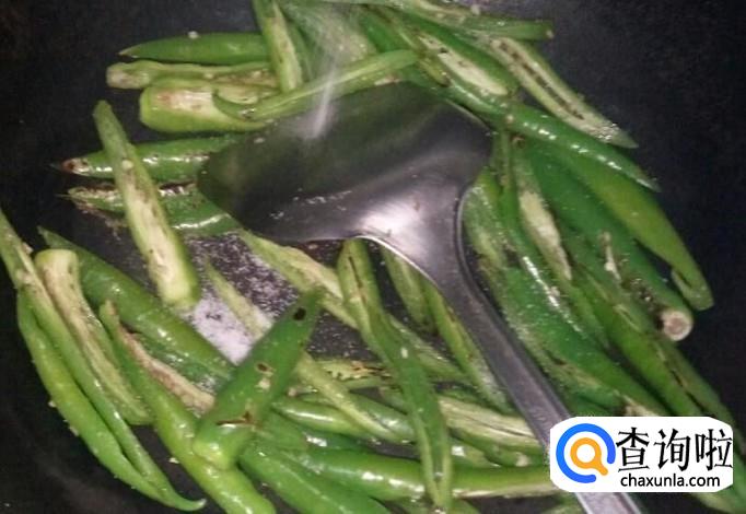 翻炒至辣椒略熟,两面微焦,此时加入适量盐。盐的量应该足以让辣椒有咸味。
