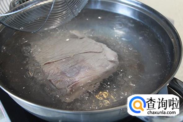 然后洗净,放入锅里煮熟,水里加少许盐和姜片。用筷子插肉,没有血水冒出就熟了。