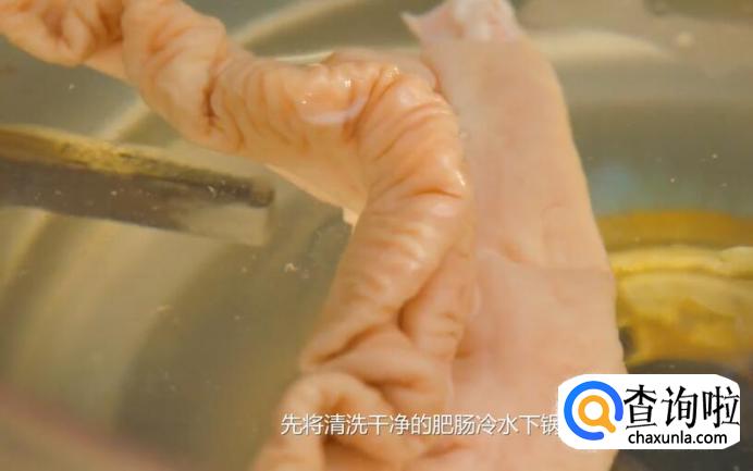 先将清洗干净的肥肠冷水下锅。