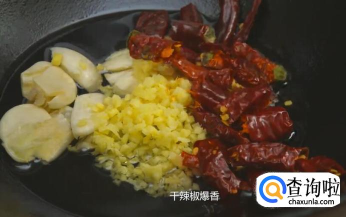 起锅,加入油,下大蒜、姜末、干辣椒爆香。